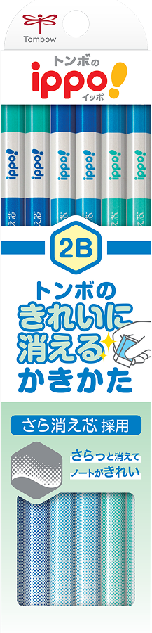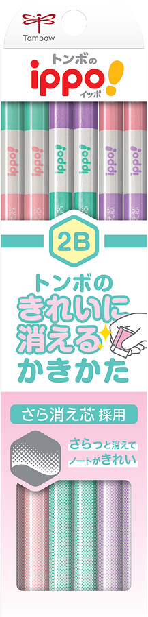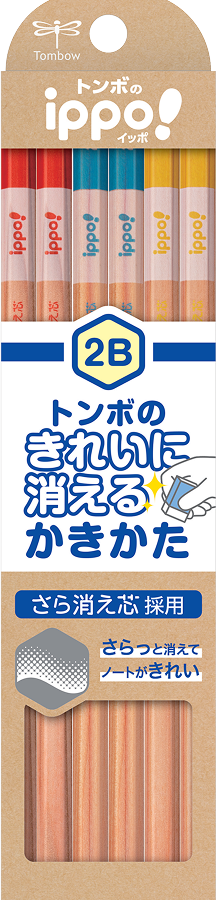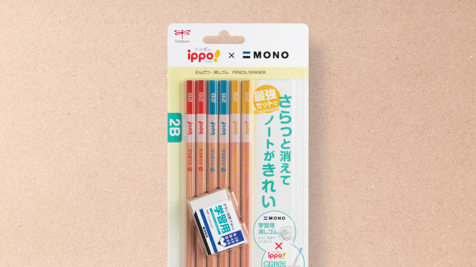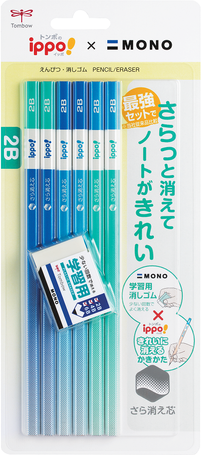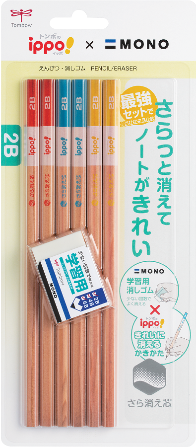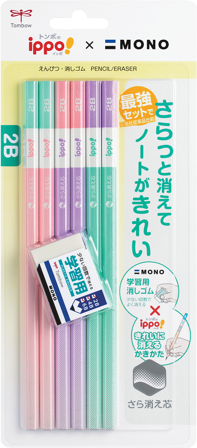 2Bの鉛筆6本と消しゴム1つのセットもラインナップ。消しゴムは濃い鉛筆も少ない回数で消える「モノ学習用消しゴム」。