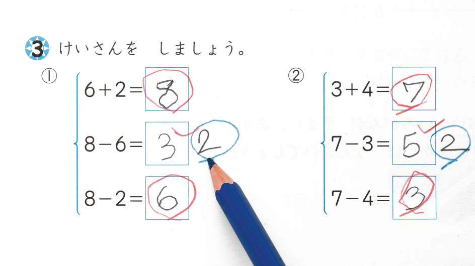 赤えんぴつで丸つけした後、2回目の丸つけに青えんぴつを使うと間違えた箇所を確認しやすく、復習に便利です。